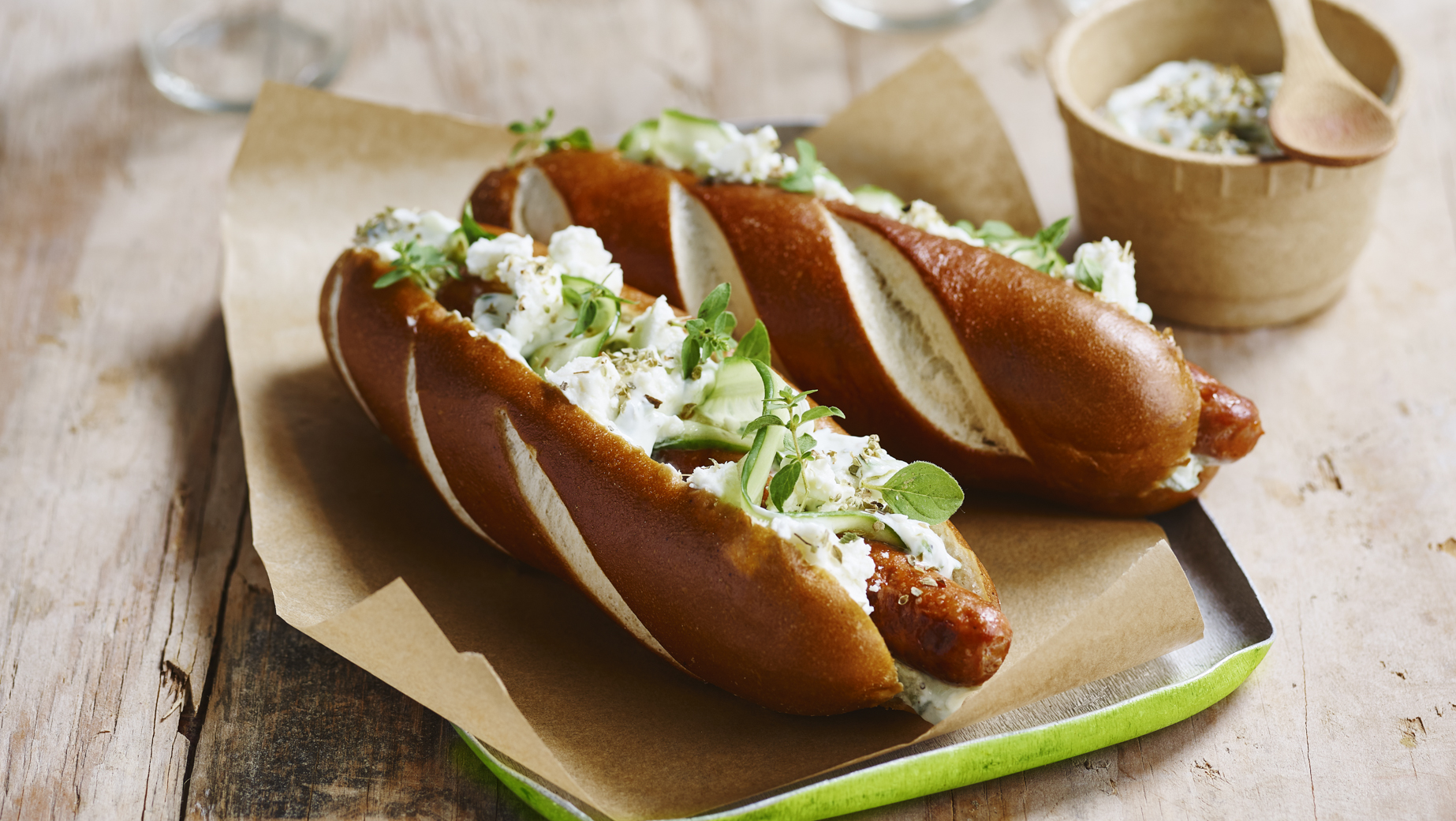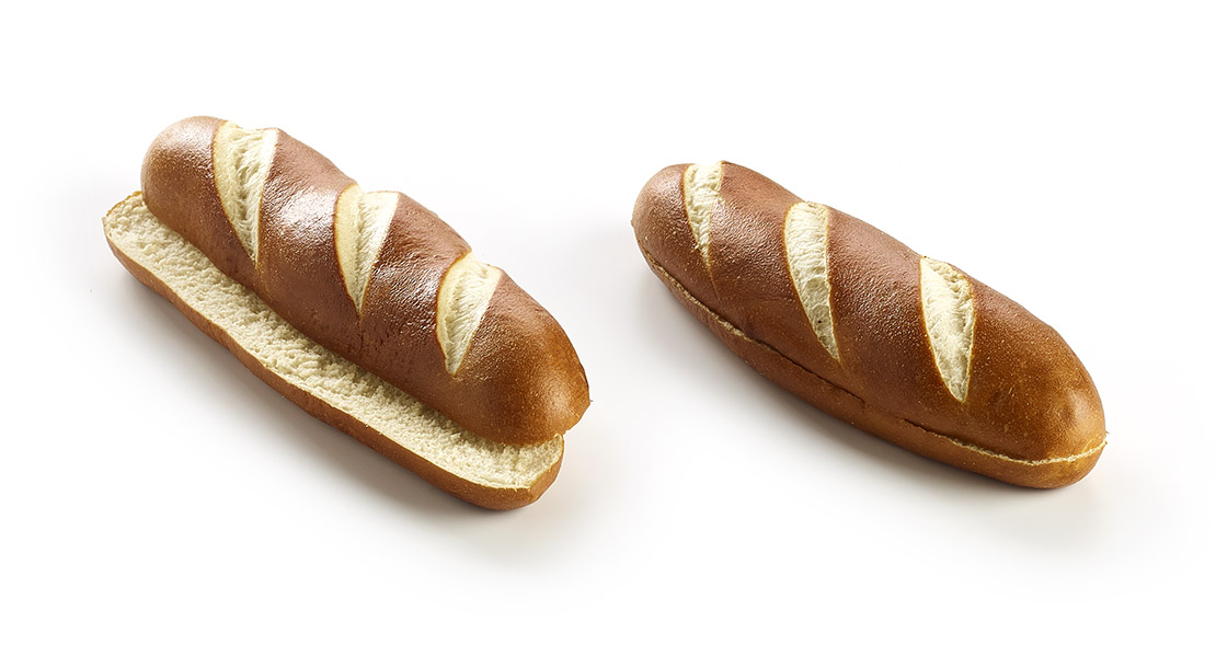 Langes Weizenbrötchen der 'Laugengebäck'-Familie, eine deutsche Spezialität, mit einem typischen Brezelgeschmack und einer braunen Kruste, abgewechselt mit hellen Einschnitten, vorgeschnitten. Ideale Form als Hot Dog-Brötchen.