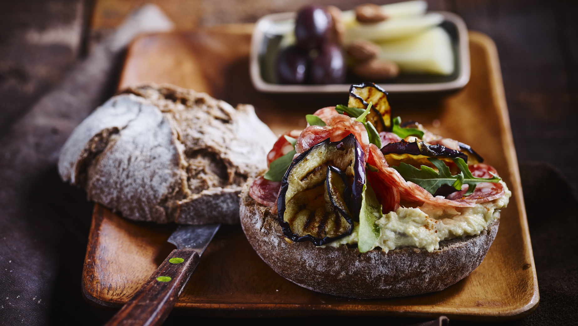 Dunkles Weizenbrötchen mit einer ausdrucksvollen, berstenden Kruste und einer saftigen, luftigen Krume. Aus Weizenmehl mit Gerstenmalz und Roggensauerteig, angereichert mit Kartoffelflocken und Joghurt als geheimer Zutat hergestellt, für eine anhaltende sensorische Frische.
