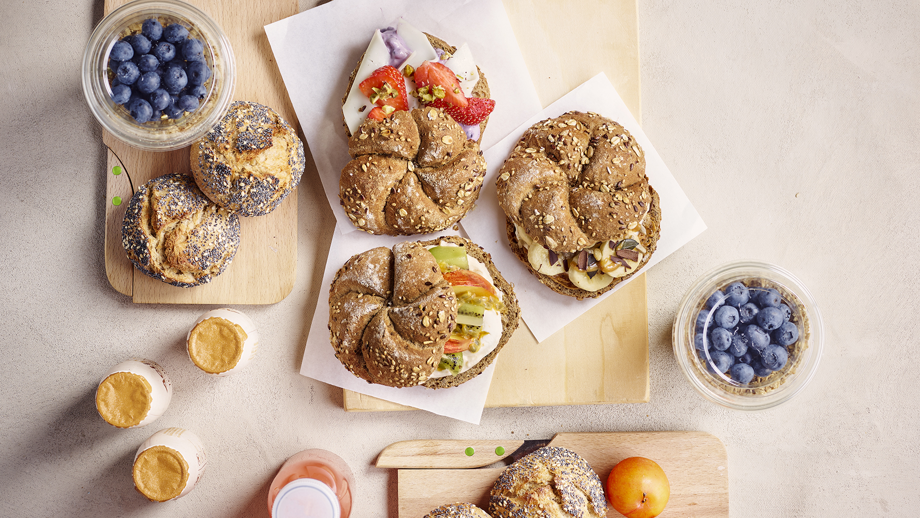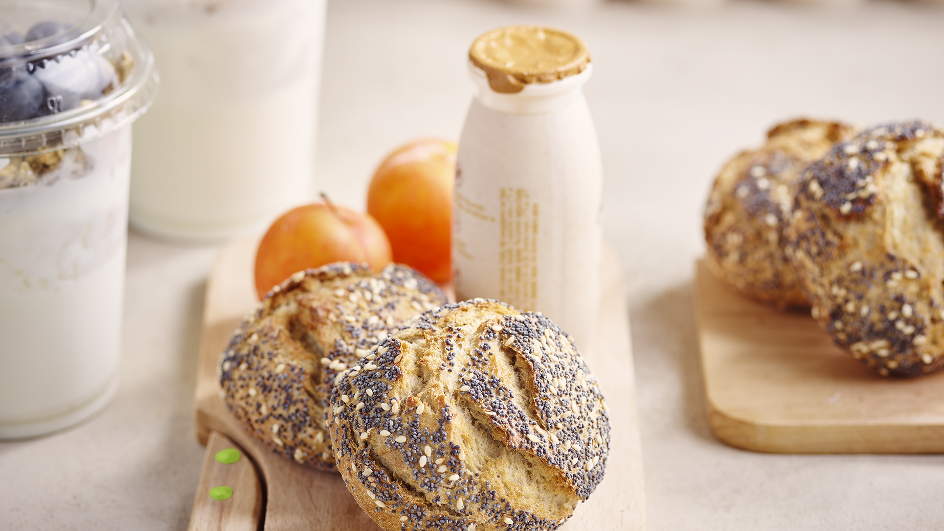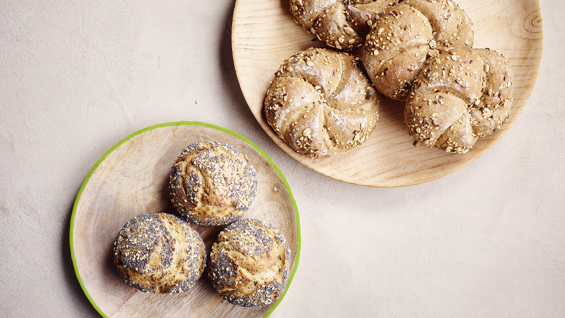Kleines Mehrkornbrötchen mit einer ausdrucksvollen, berstenden Kruste und einer saftigen, luftigen Krume. Hauptsächlich hergestellt aus Dinkelmehl mit Weizenmehl, Roggensauerteig, Sonnenblumenkernen, Kartoffelflocken und Joghurt als geheimer Zutat für eine anhaltende sensorische Frische. Verbessert durch einige Noten Koriander, Fenchel und Kümmel für ein exquisites Aroma. Verziert mit Sesam und Mohn.