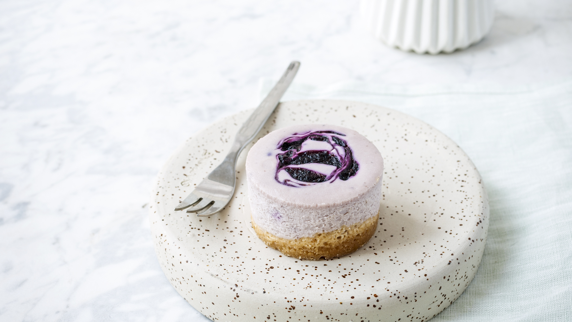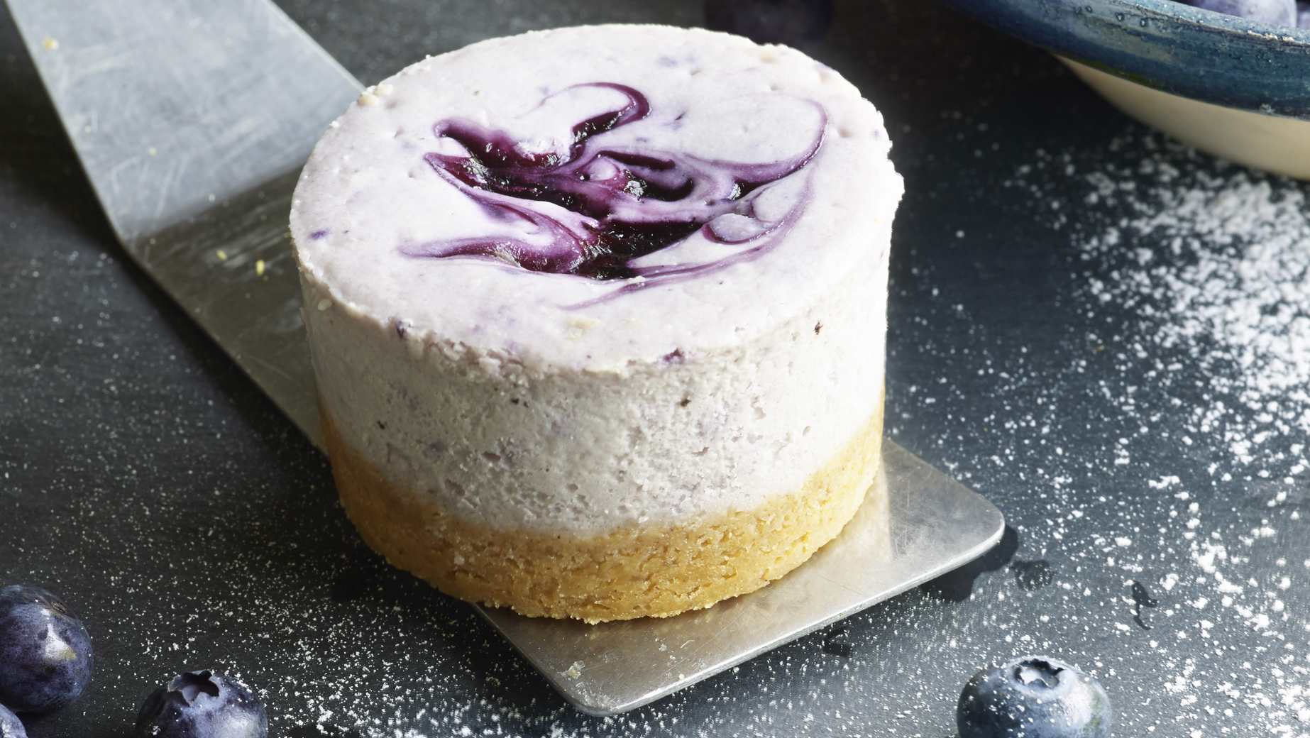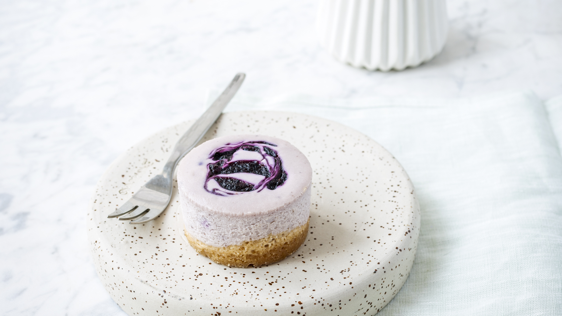 Käsesahnekuchen in Portionsgröße mit Heidelbeeren auf einem Mürbeteigkeks.
