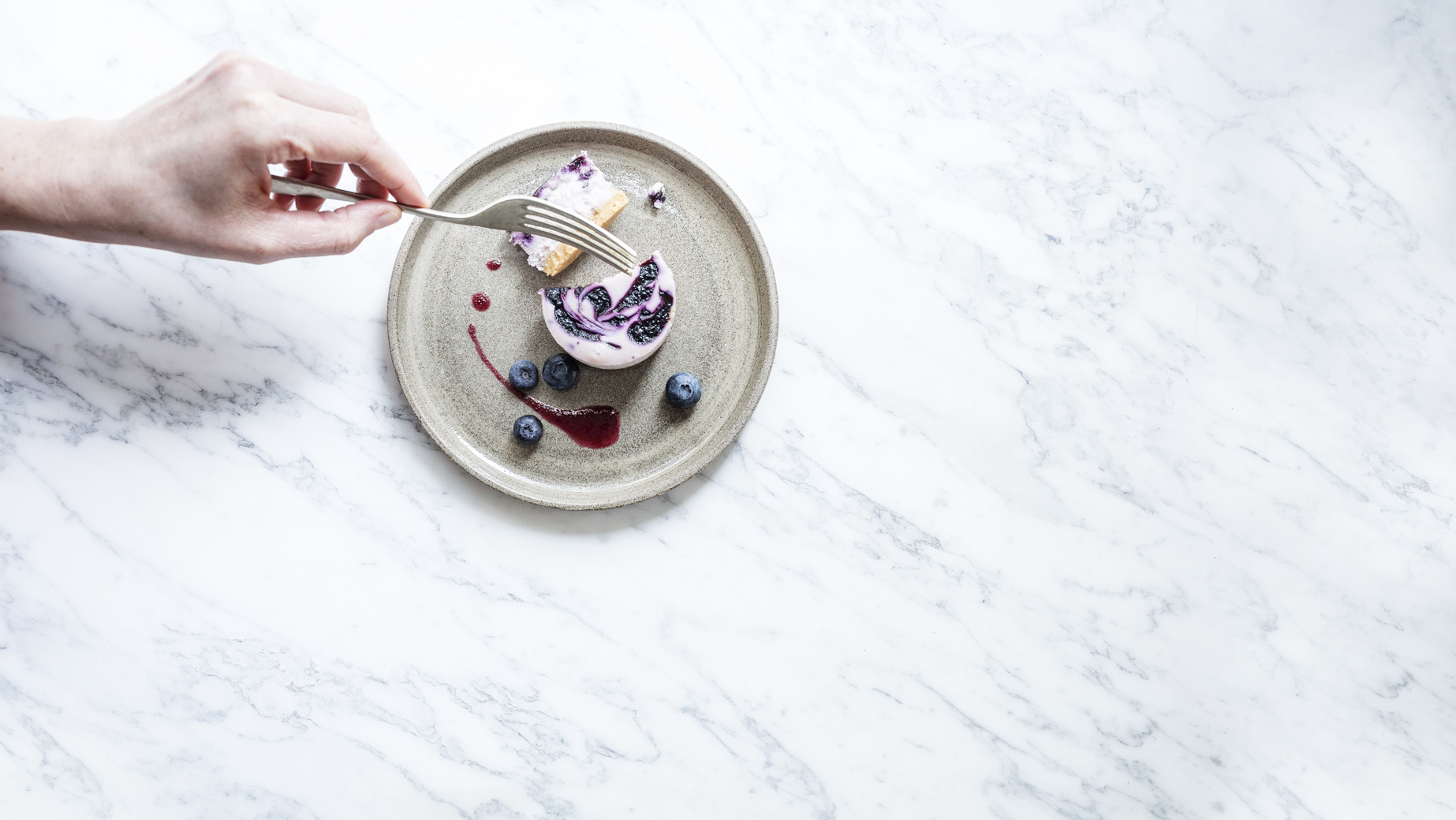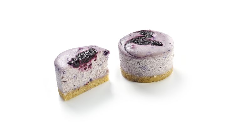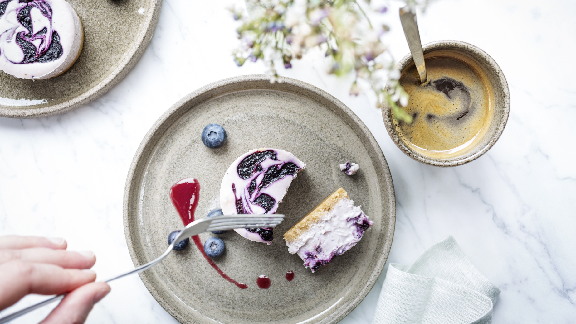 Käsesahnekuchen in Portionsgröße mit Heidelbeeren auf einem Mürbeteigkeks.
