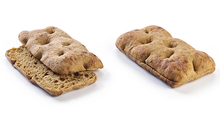 Traditionelles italienisches Fladenbrot. Eine Art Focaccia mit einer Mischung von Vollkorn, Roggenmehl, Dinkel, mit einer offenen Krumenstruktur, extra nativem Olivenöl und einer Mischung von Hirse, Leinsamen und Sonnenblumenkernen und auf Stein gebacken. Ideal zum Füllen.