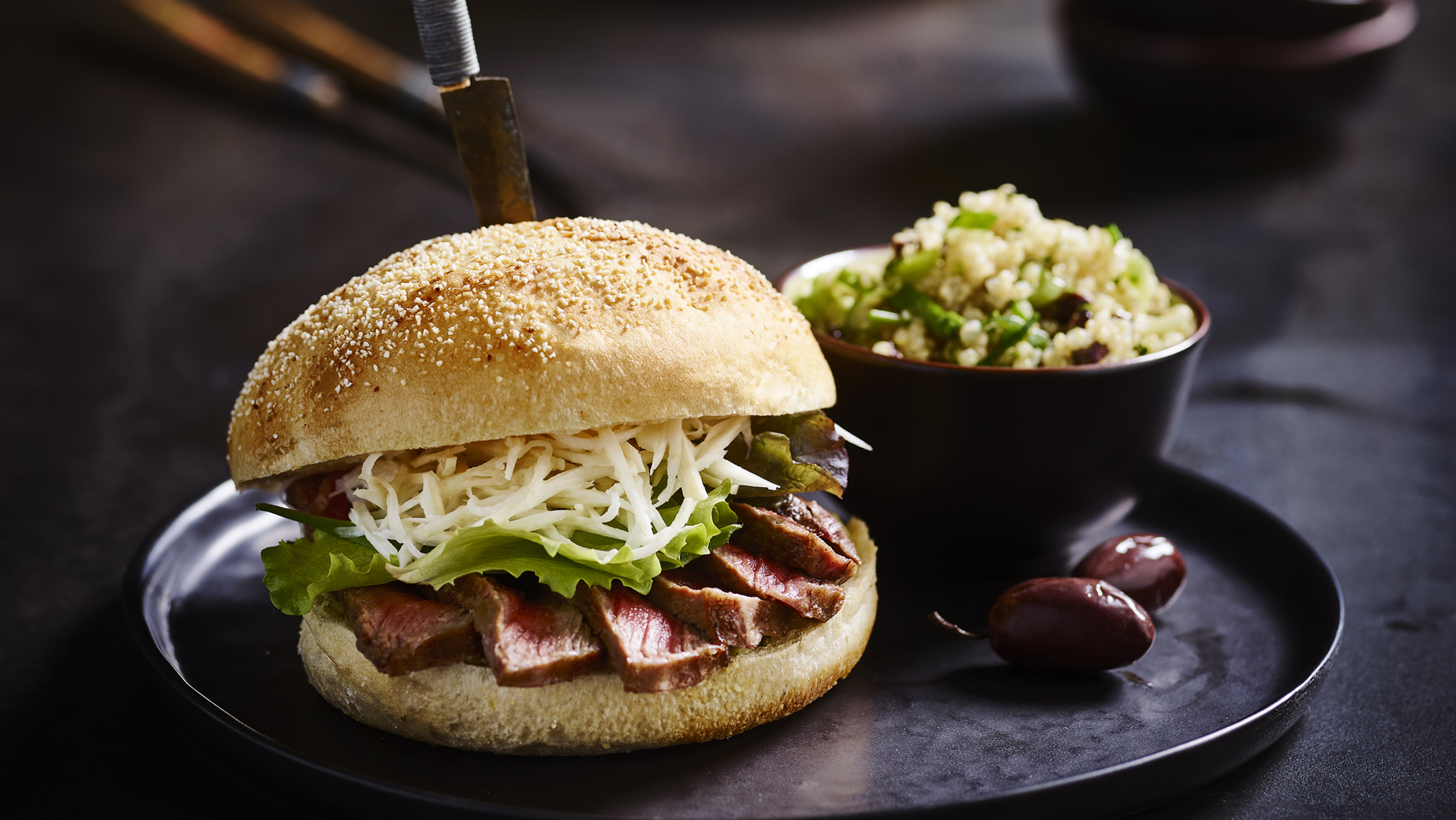 Erstklassiges Burger-Brötchen/Sandwichbrötchen mit einer dünnen, knusprigen Kruste und einer weichen, luftigen Krume. Aus Weizenmehl und Weizensauerteig, mit doppelt gemalztem Bier. Veredelt mit Olivenöl und mit Grieß garniert, vorgeschnitten.