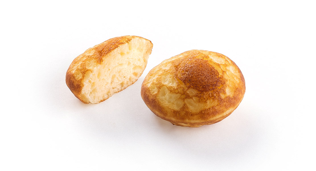 Mini-Pfannkuchen aus einem Teig nach traditionellem niederländischem Rezept mit Weizenmehl, Eiern, Zucker, Milch und Treibmittel.