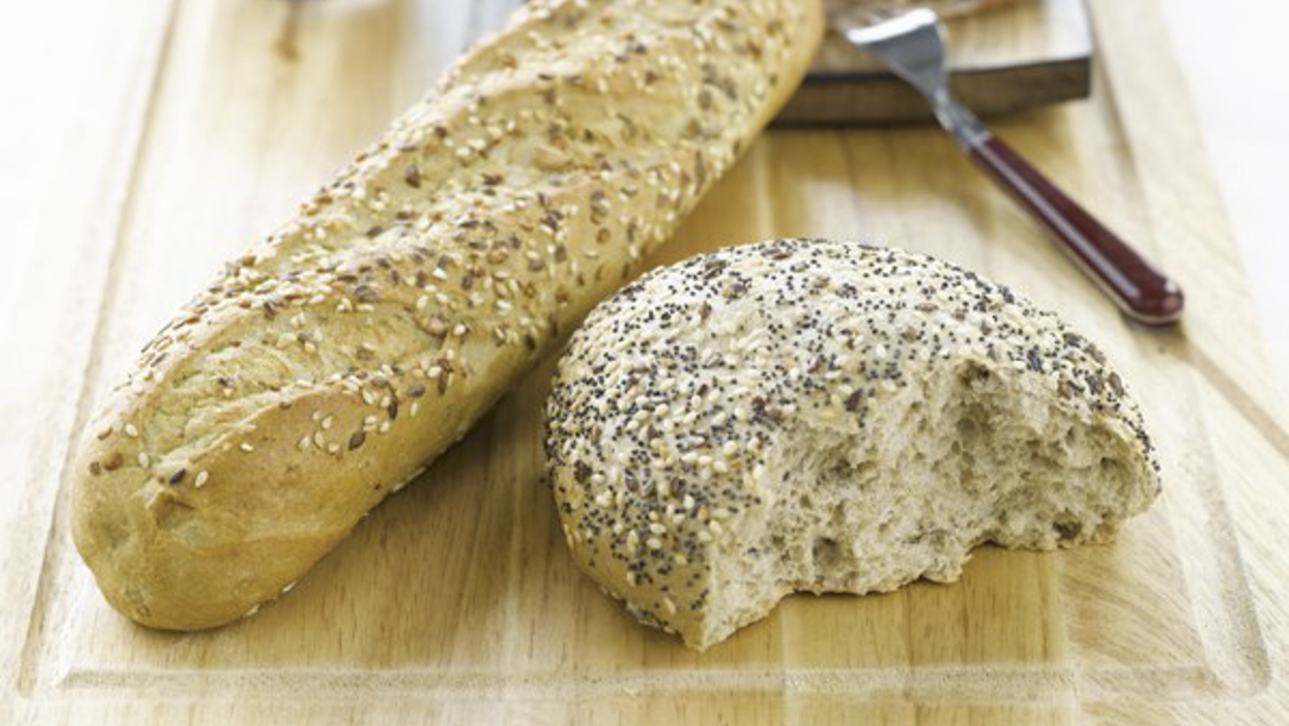 Pan bagnat con semillas totalmente horneado; salpicado con abundantes semillas de girasol, sésamo, amapola y lino.