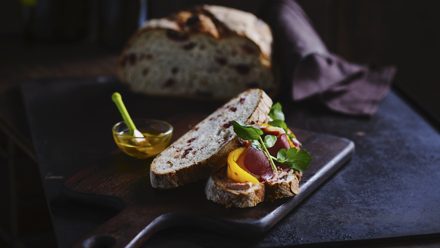 Un pan de trigo de masa madre enriquecido con arándanos para obtener un armonioso equilibrio de sabores dulces y amargos, con un encantador toque de mantequilla.