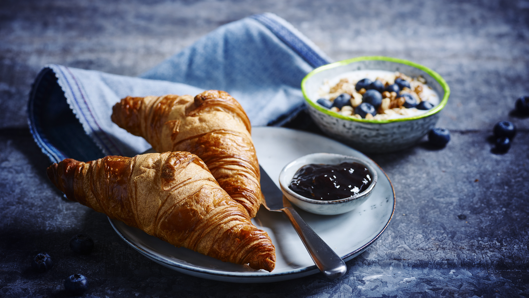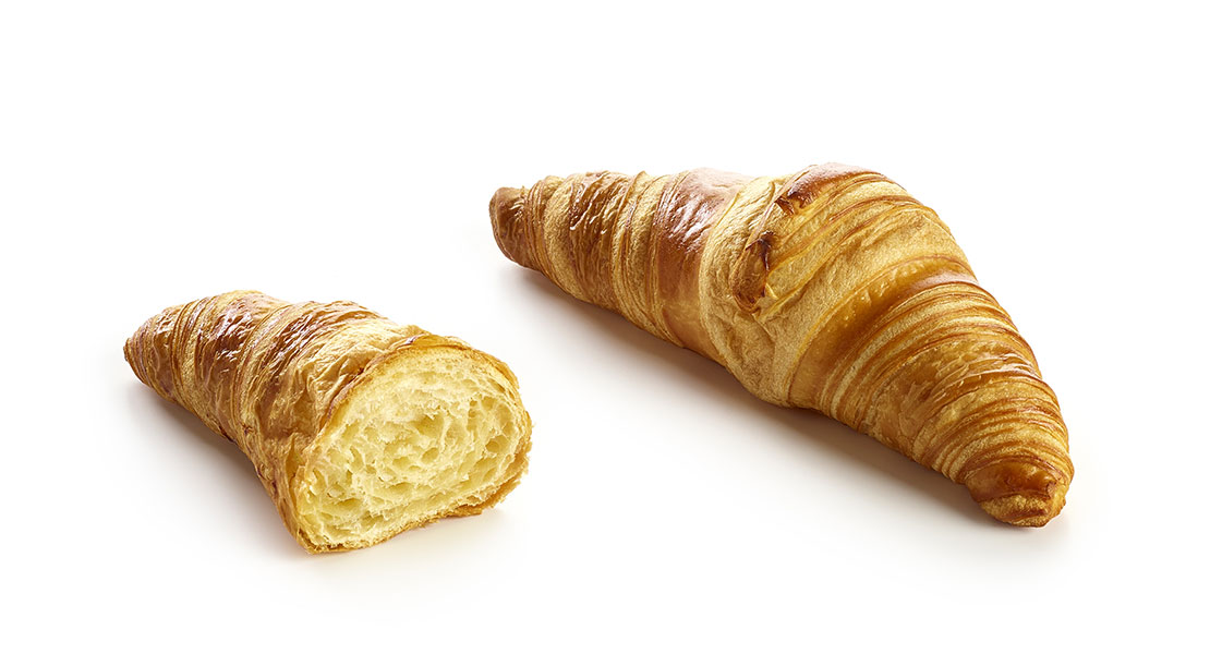 Croissant francés clásico con mantequilla, las capas abiertas de la masa de levadura laminada le confieren un buen volumen, pintado con huevo. Hecho con 18% de mantequilla (porcentaje de la receta total).