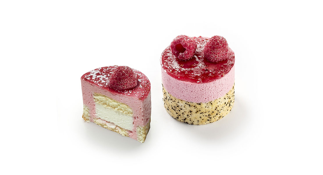 Bavarois individual de frambuesas y limón, acabado con bizcocho de almendras y frambuesas.
