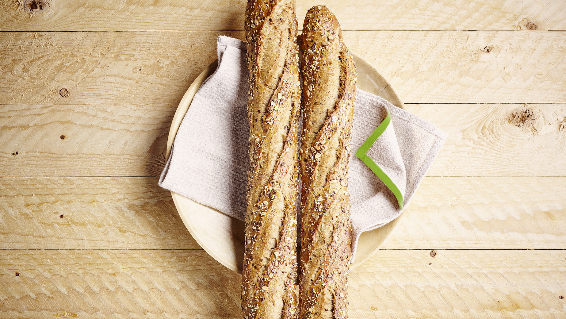 Auténtica baguette multicereal de masa fermentada con abundantes semillas y granos: linaza, semillas de sésamo, semillas de girasol, copos de avena, sémola de avena, salvado de trigo, copos de trigo, centeno molido grueso y malta de cebada tostada, horneada a la piedra.