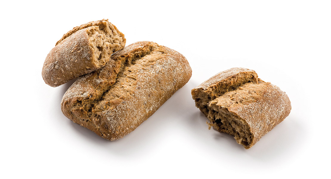 Panecillo moreno artesanal y natural, de trigo, tipo chapata, con semillas de sésamo, linaza y malta de cebada, amasado a mano y horneado a la piedra.