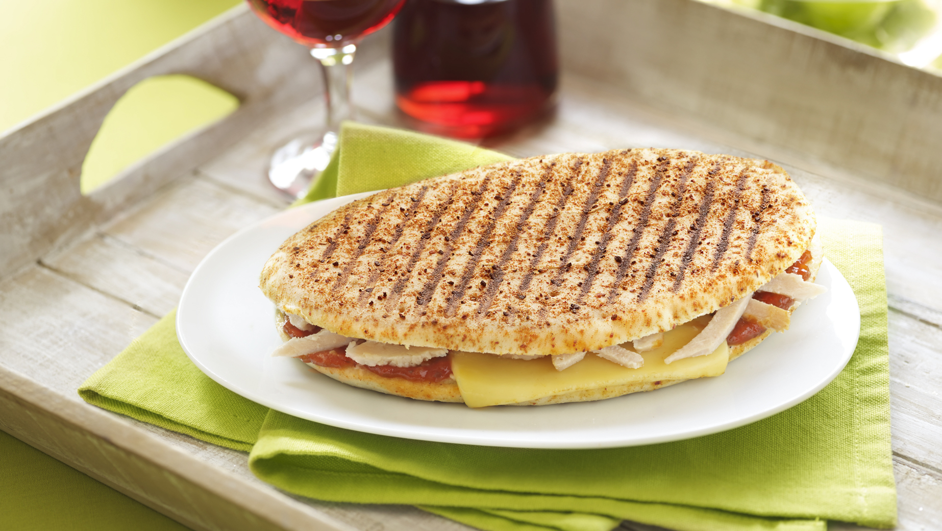 Panini espolvoreado con pimentón, con pollo, queso y salsa de tomate.