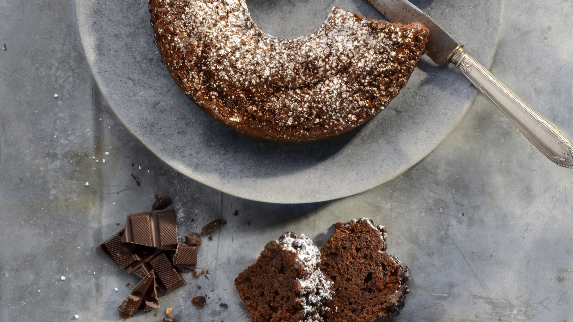 Bizcocho de chocolate (con huevo entero) húmedo y tierno, enriquecido con pepitas de chocolate negro belga, recubierto de gelatina de albaricoque y espolvoreado con azúcar glas. Excelente como pastel para el desayuno, fantástico para la merienda.