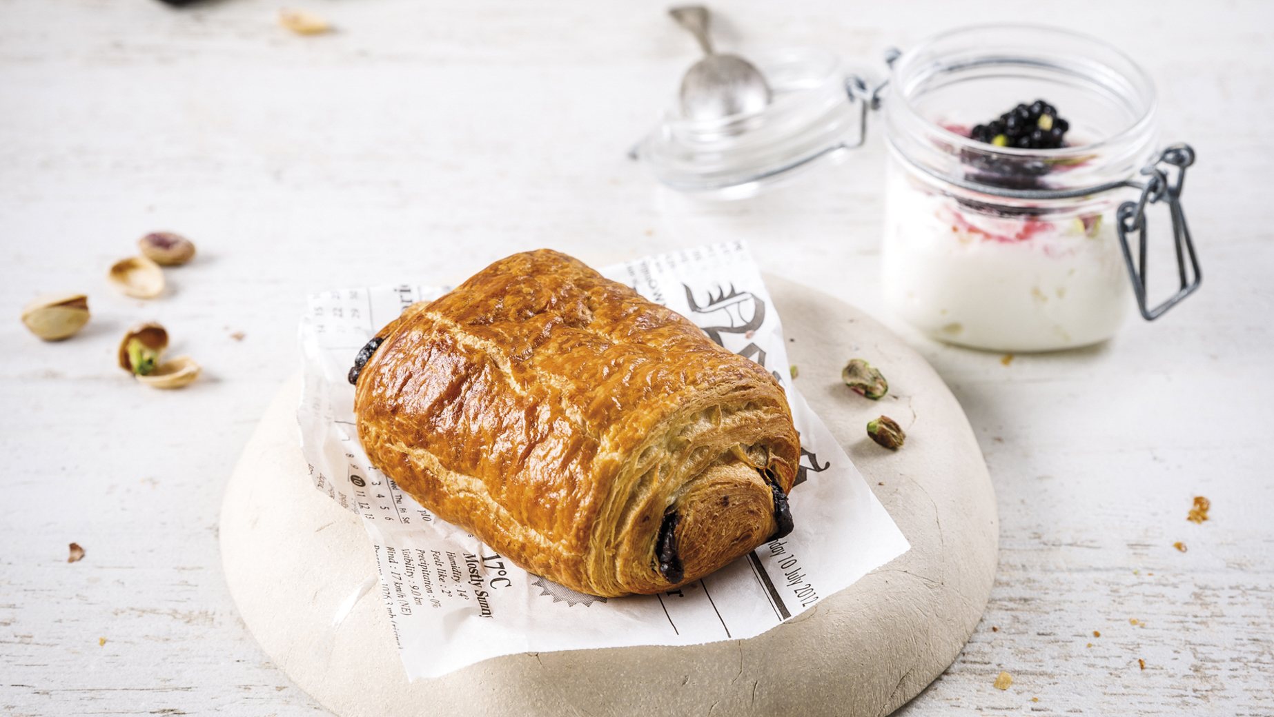 Bollo de chocolate de masa de levadura laminada elaborada con mantequilla y dos barras de chocolate negro. Hecho con 16% de mantequilla (porcentaje de la receta total).
