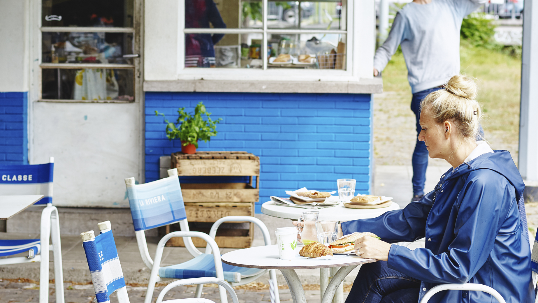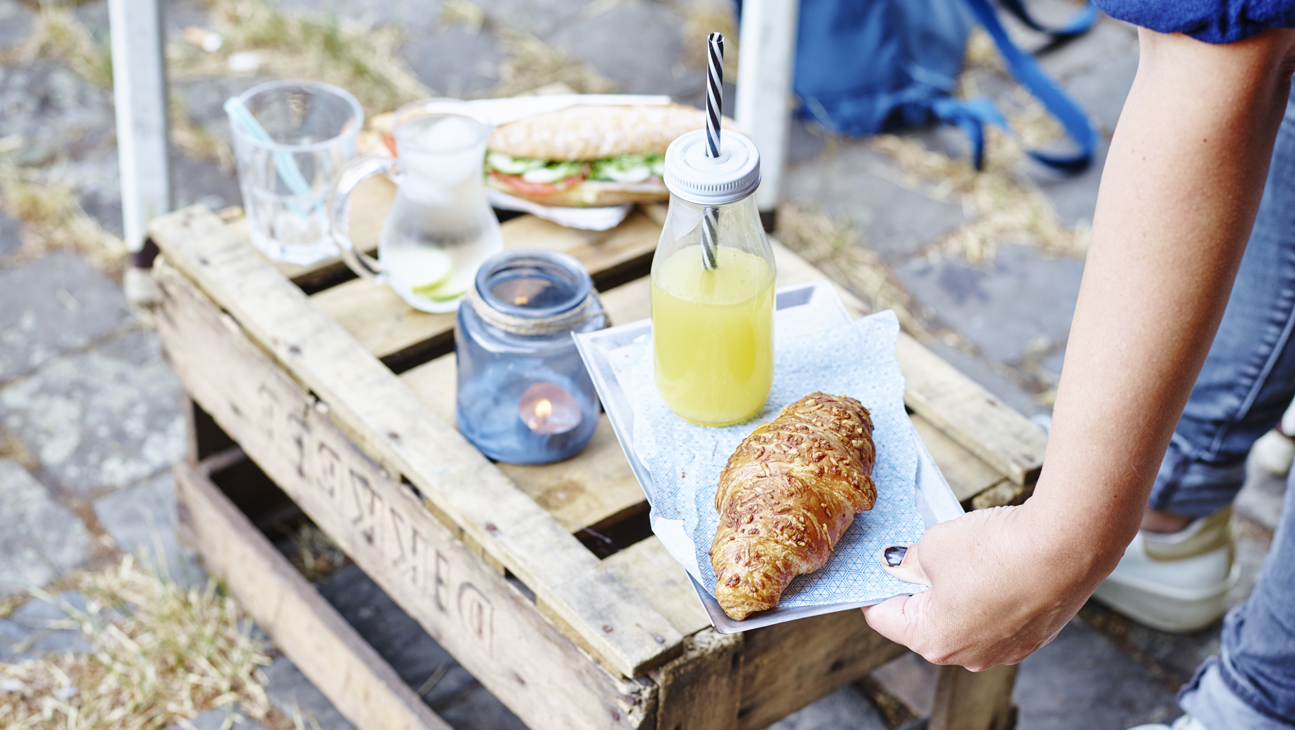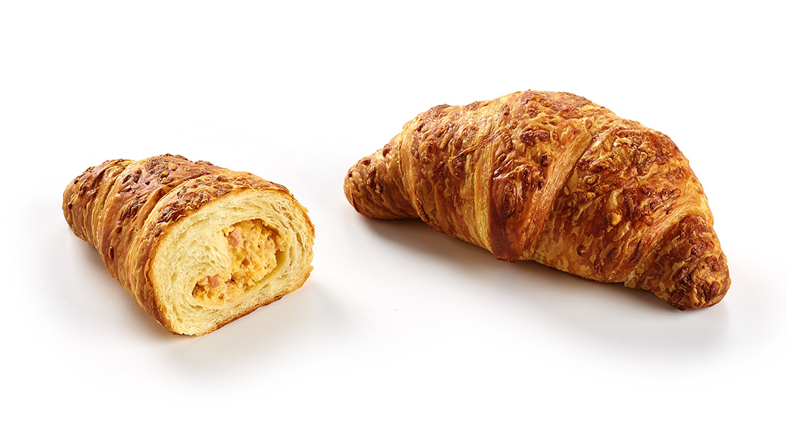Bonito y voluminoso cruasán de mantequilla en capas con relleno de queso Gouda y daditos de jamón cocido, cubierto de crujiente queso Gouda.