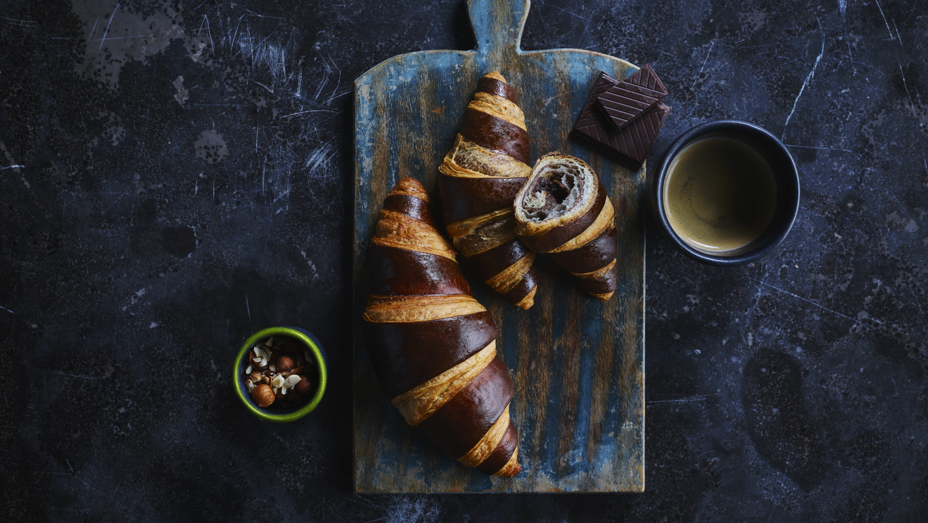 Bonito y voluminoso cruasán de mantequilla de dos colores a capas, creado gracias al abrazo de dos sabores de masa de levadura laminada (natural y de cacao) con un sabroso relleno de choco. Hecho con 16% de mantequilla (porcentaje de la receta total).