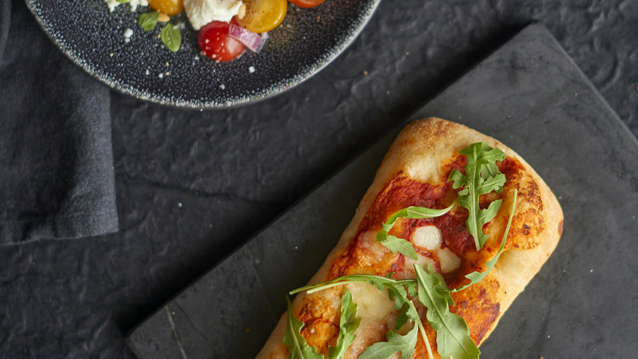 Schiacciata tradicional italiana, un tipo de focaccia horneada a la piedra, con una estructura de miga abierta, recubierta de mozzarella, puré de tomate, aceite de oliva virgen extra y orégano.