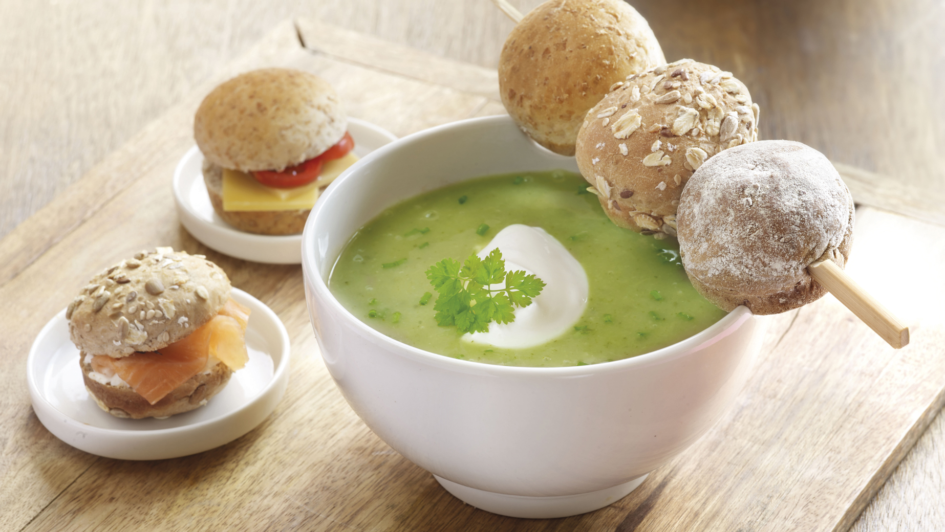 Caja surtida de 3 tipos de minipanecillos blandos: 80 panecillos morenos multicereal, 80 panecillos con salvado de trigo, 80 panecillos multicereal decorados con copos de avena, linaza, sésamo y pipas de girasol.