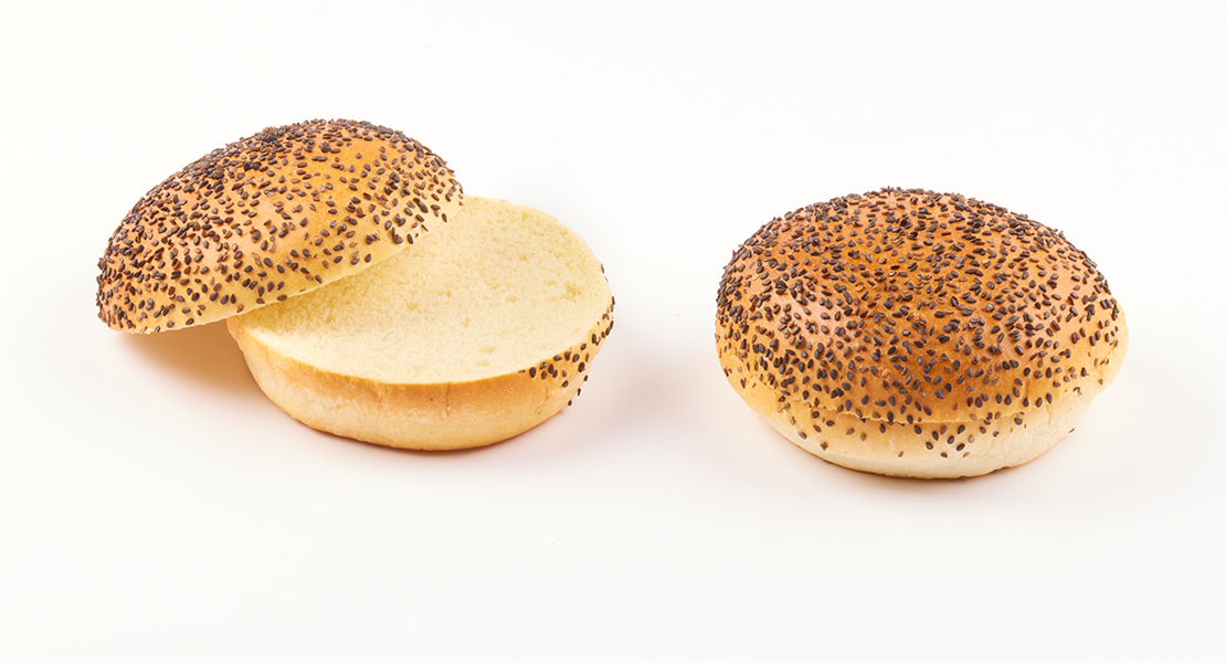 Panecillo de brioche premium. Glaseado, con una corteza sin grietas y una miga esponjosa. Elaborado con harina de trigo y mantequilla. Espolvoreado generosamente con semillas de sésamo negro. Precortado.