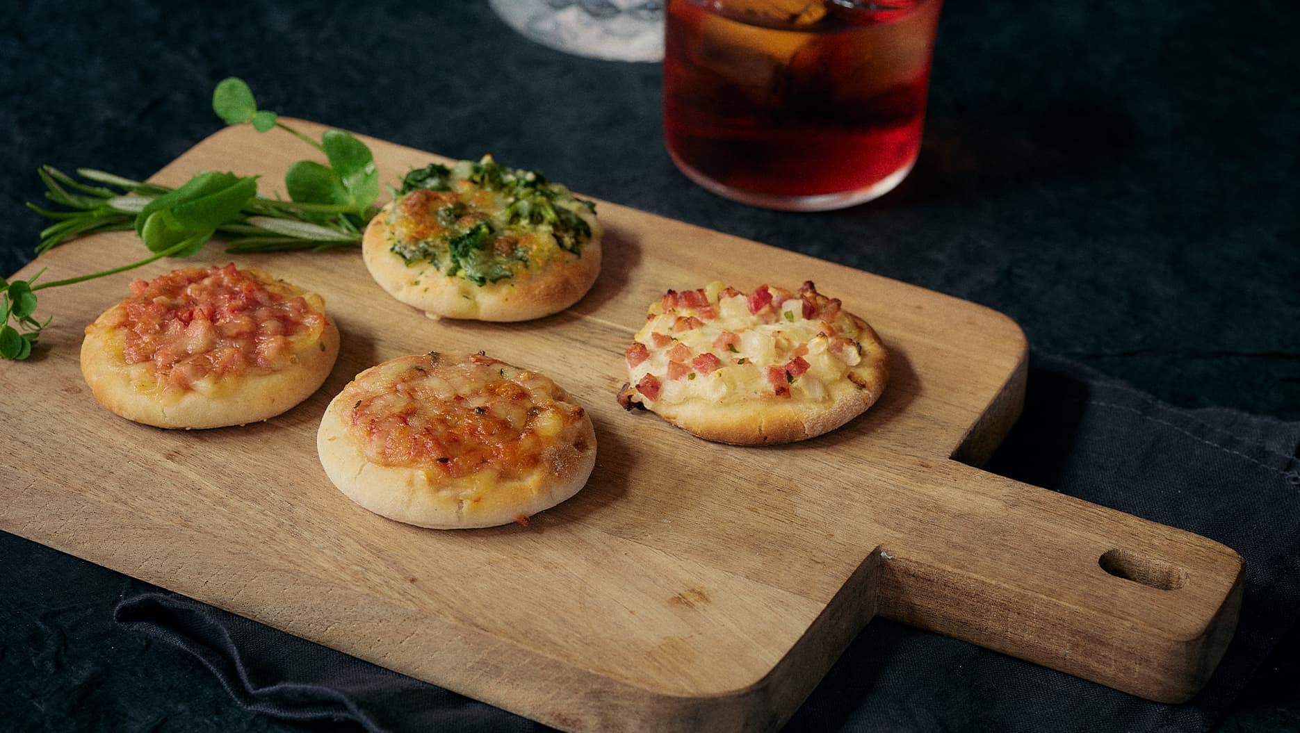 Minipizzas para aperitivo de tamaño bocado, hechas con masa de pizza con salsa de tomate, jamón y queso emmental.
